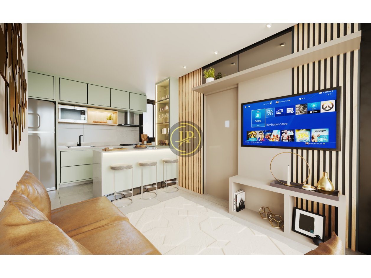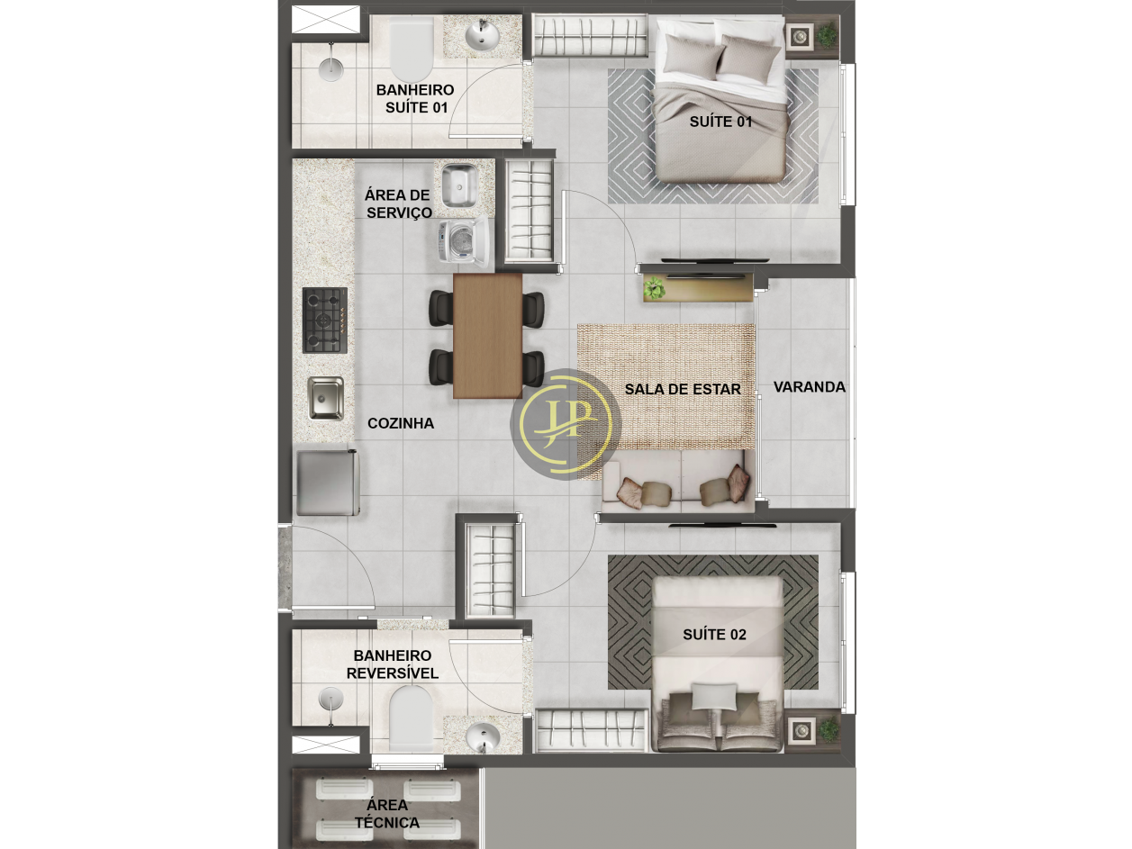 Excelente apartamento de 68,16M² com 2 quartos/2 suítes, 2 banheiros, um deles com entradas pelo quarto e pela cozinha, sala com dois ambientes, cozinha e varanda.