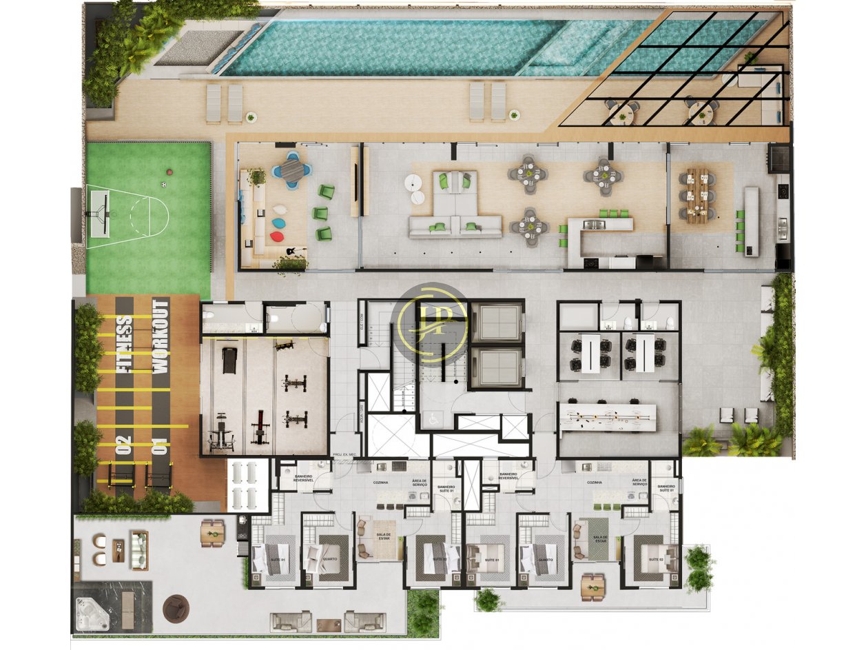 Área de Lazer e Serviços: Piscina Adulto e Infantil, Lounge de piscina, Spa aquecido, Deck, Pub Grill, Confraria, Teen Room, Quadra de esportes, Espaço fitness, Fitness Workout, Coworking, Lounge externo, Pet Wash, Central delivery e Lavanderia.
