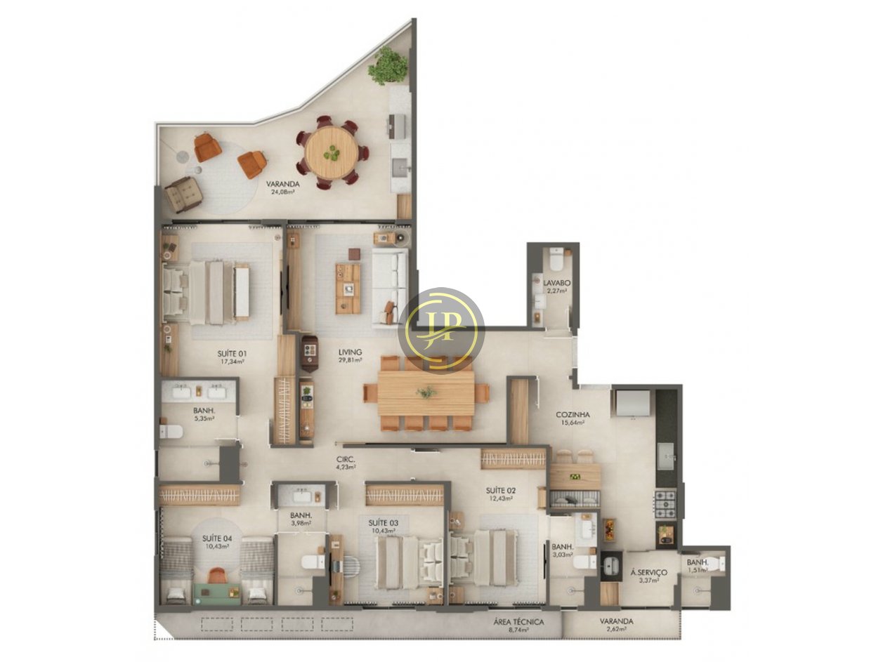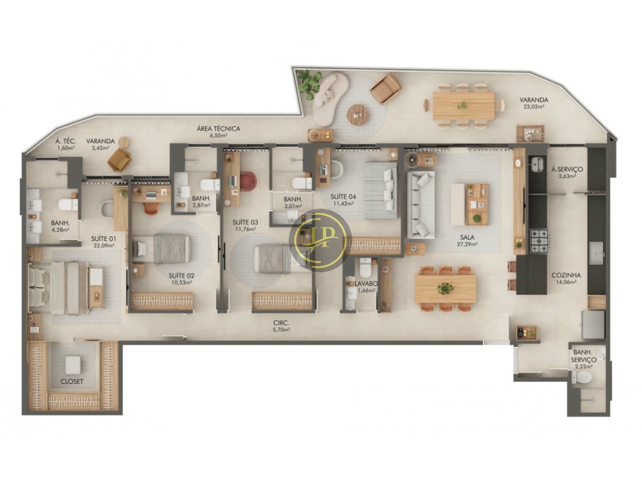 Apartamento de 04 suítes, sala para dois ambientes, varanda, espaço garden, lavabo, cozinha, área de serviço, banheiro de serviço e 03 vagas de garagem.