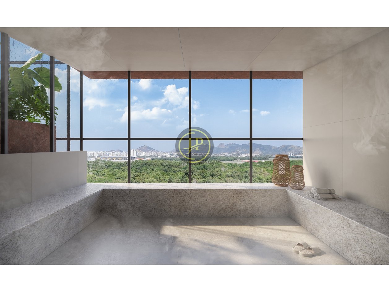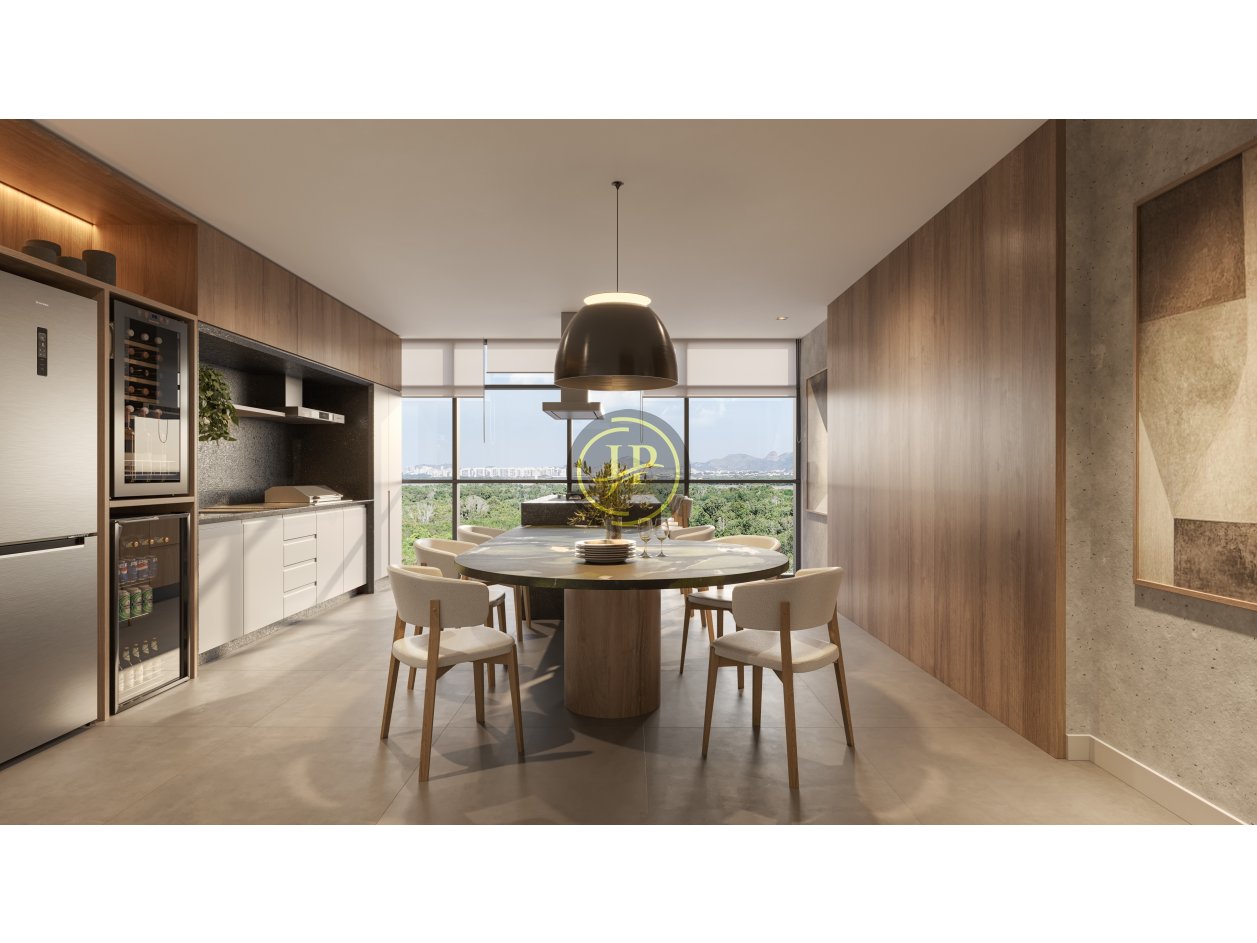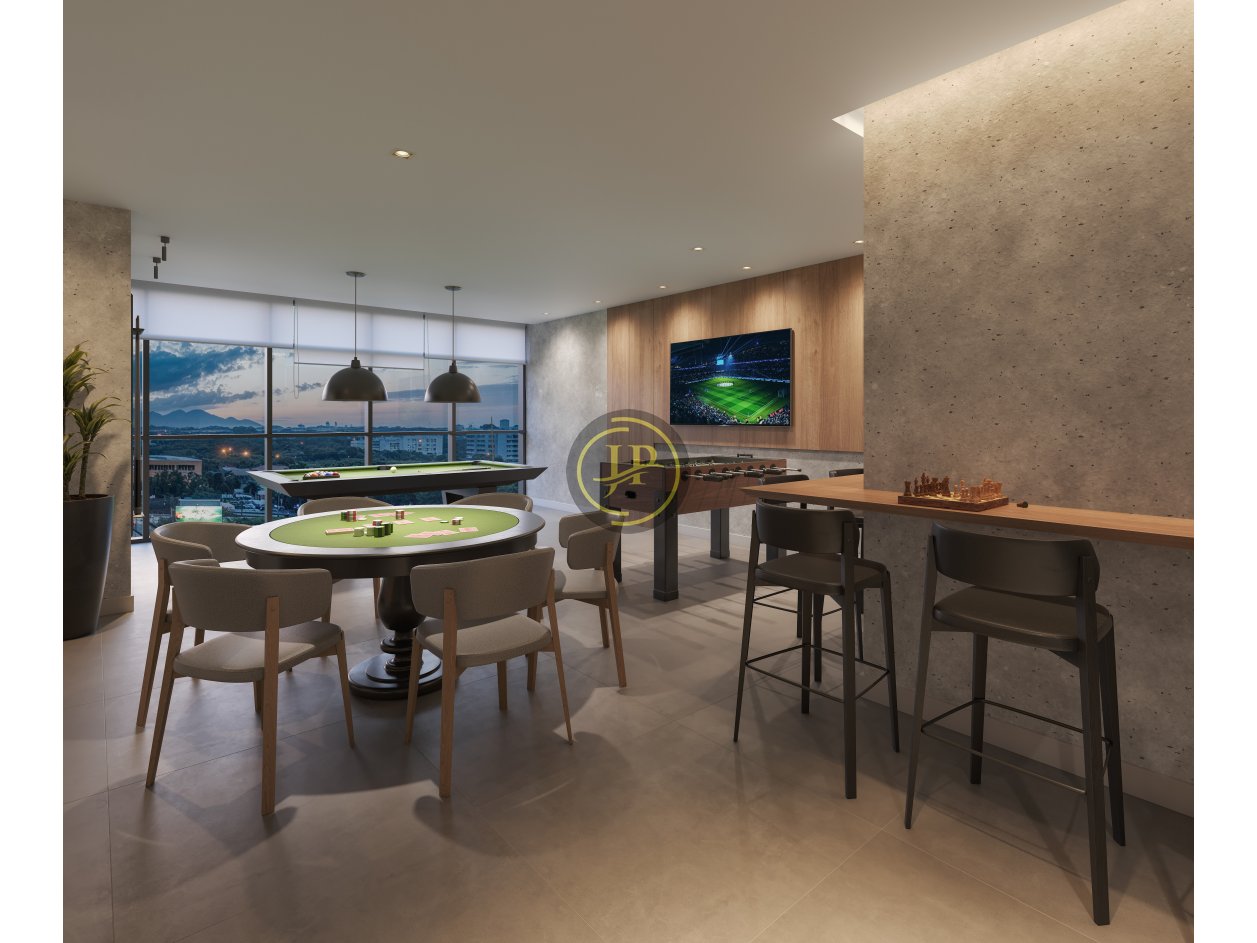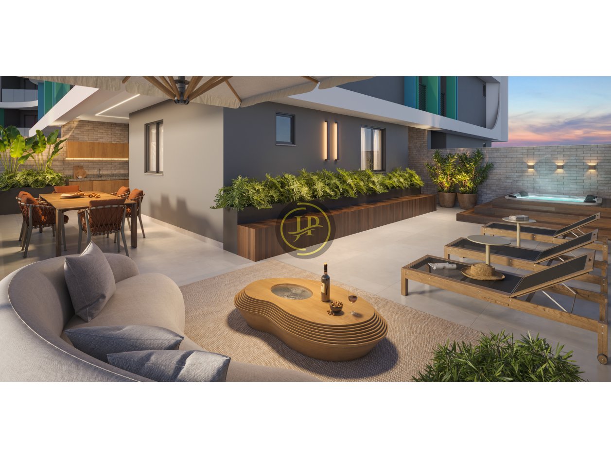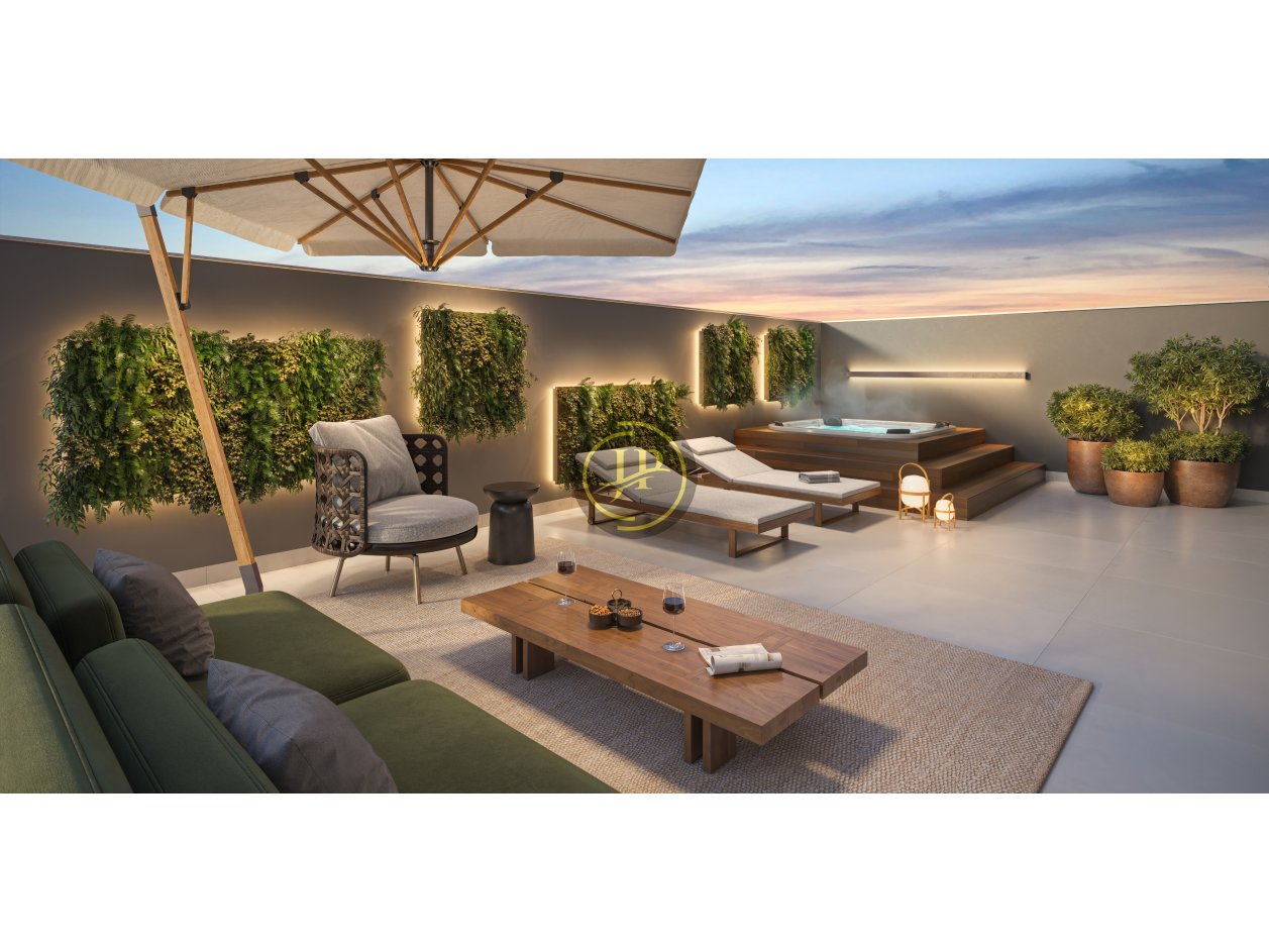 Lazer no rooftop com piscina, prainha, solarium, grill gourmet, espaço gourmet, salão de festas, salão de jogos, brinquedoteca, coworking, repouso, ducha, sauna, academia, minimercado.