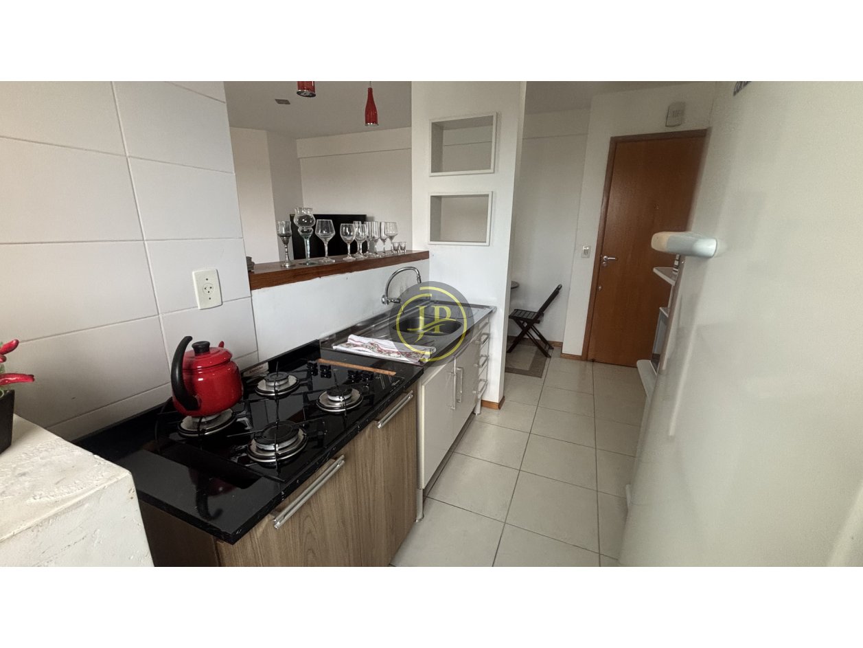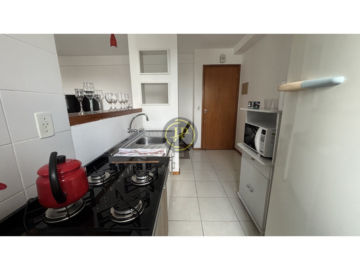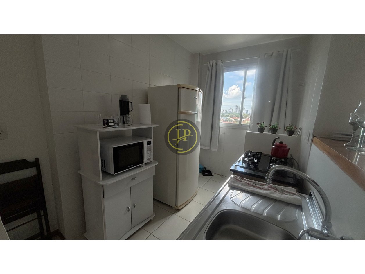 Studio mobiliado com 36m², com sofá, televisão, cama de solteiro, ar-condicionado, lavabo com armário, banheiro, cozinha com armário, cooktop, micro-ondas, geladeira e área de serviço.
