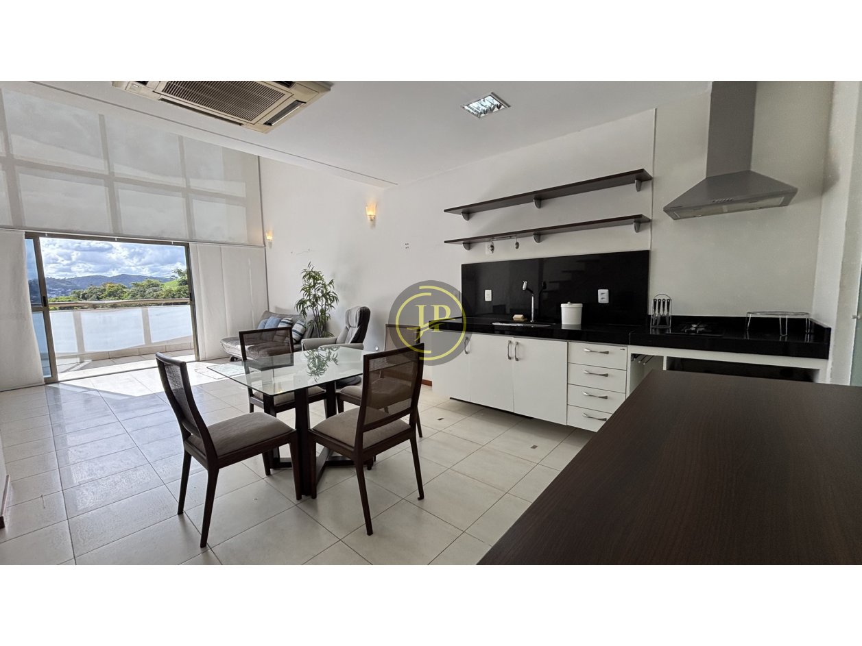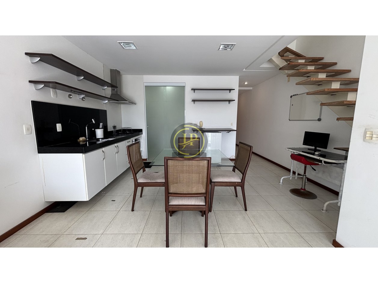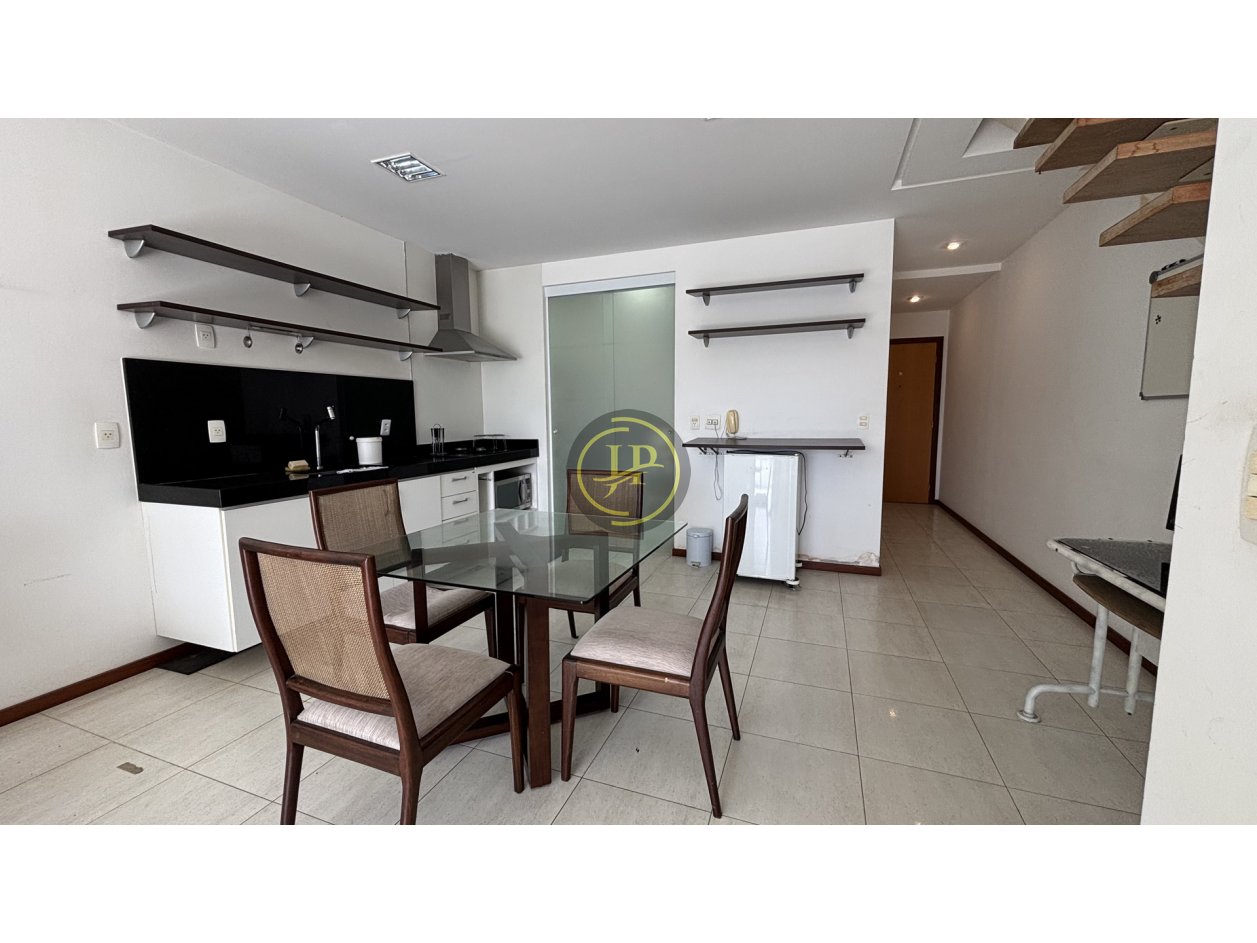 Studio com mezanino totalmente mobiliado, frente, andar alto, pé direito duplo, 01 suíte com cama box e closet, banheiro da suíte com armários, bancada em mármore blindex e espelho, sala ampla para 02 ambientes com sofá-cama, poltrona e rack, varanda com vista livre, lavabo com bancada em mármore e espelhos, cozinha equipada com armários sob e sobre a pia, filtro, frigobar, cooktop, micro-ondas, coifa, mesa de vidro com 4 cadeiras, área de serviço com armários e máquina de lavar, piso em porcelanato.