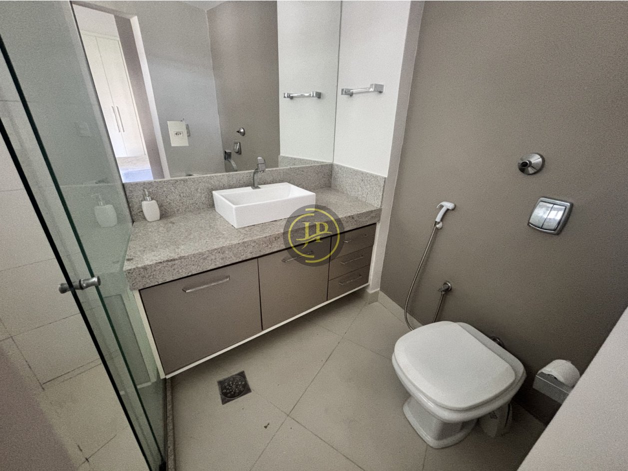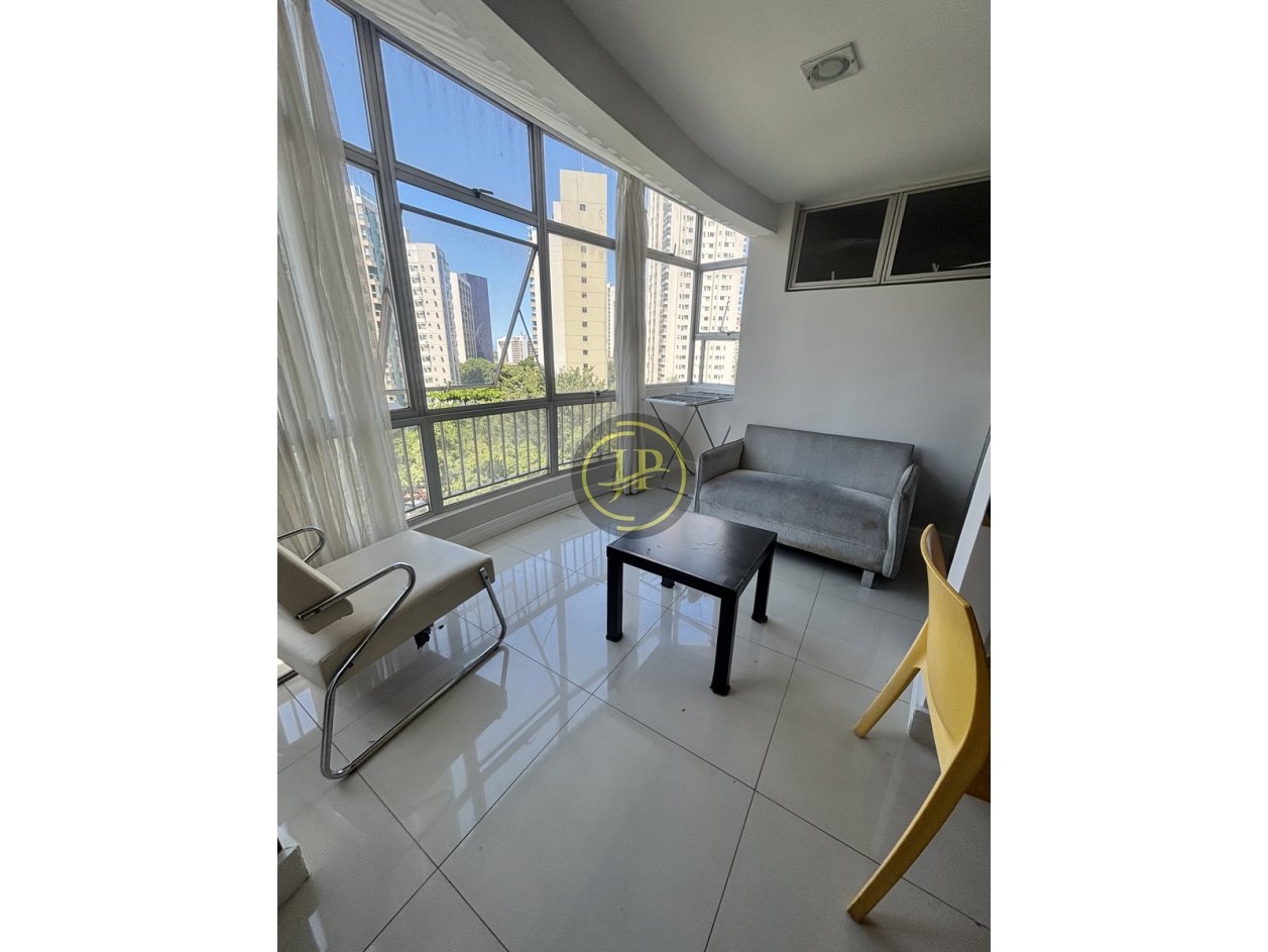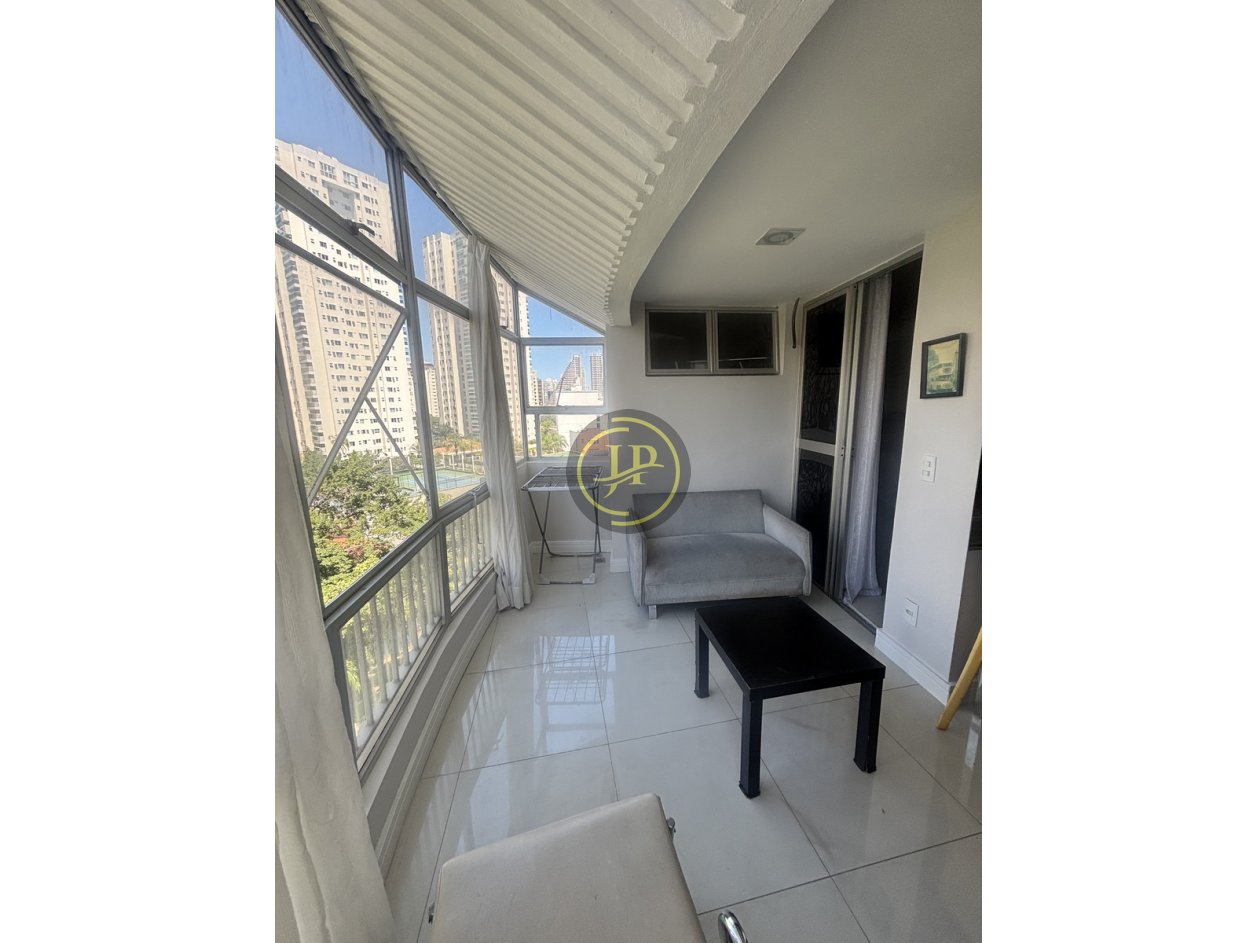 Apartamento mobiliado 1 quarto/suíte totalmente montado com armários, cama de casal, mesa para estudos e espelho, banheiro com armários e box, sala para dois ambientes com armários, sofá, televisão, mesa com 4 cadeiras, varanda com poltronas, mesa de centro e armários, cozinha com armários, geladeira, fogão e micro-ondas, área de serviço com máquina de lavar e armário.