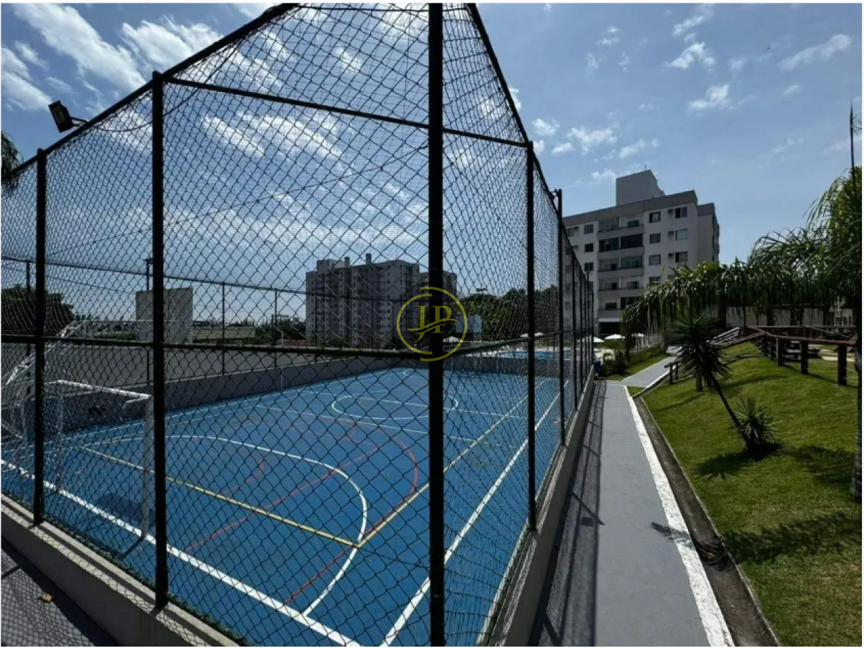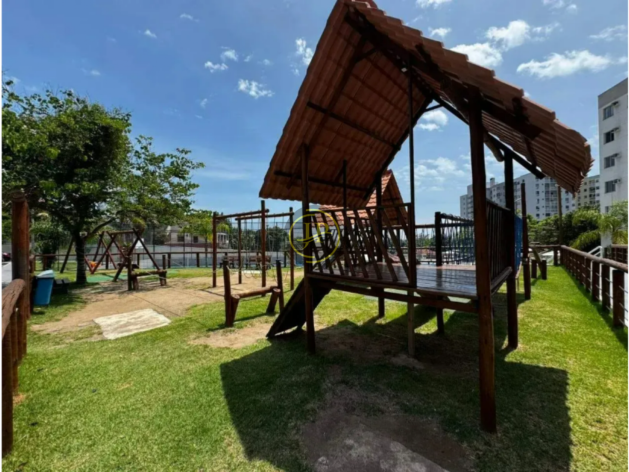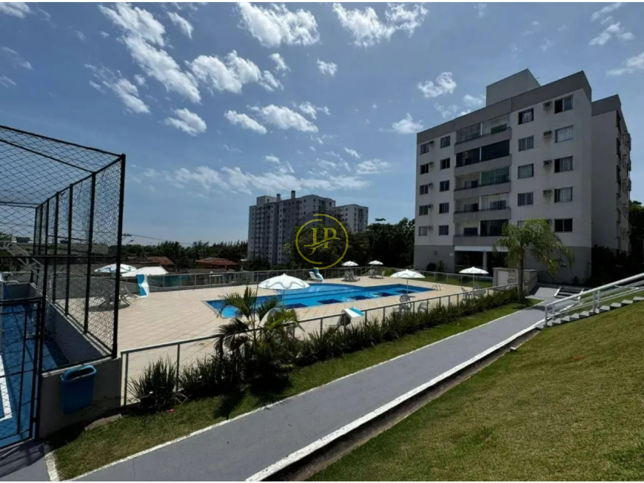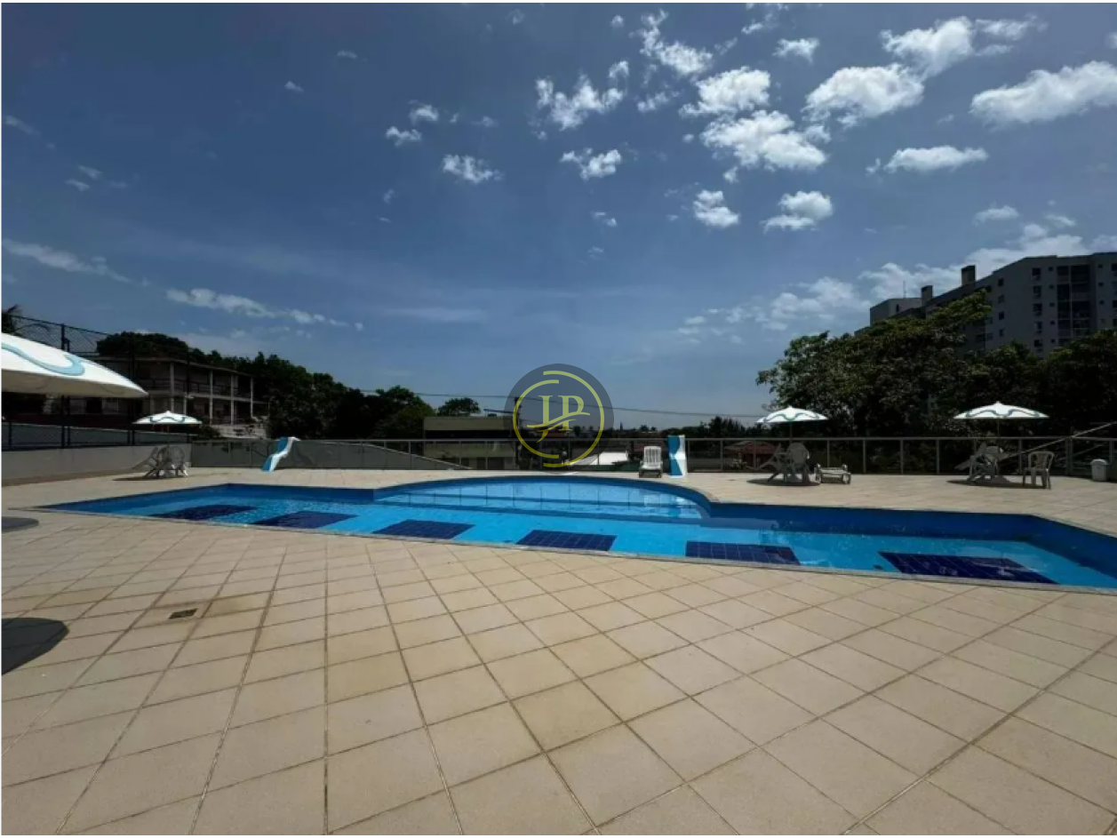 Área de lazer com piscina, churrasqueira, salão de festas, playground e quadra-poliesportiva.