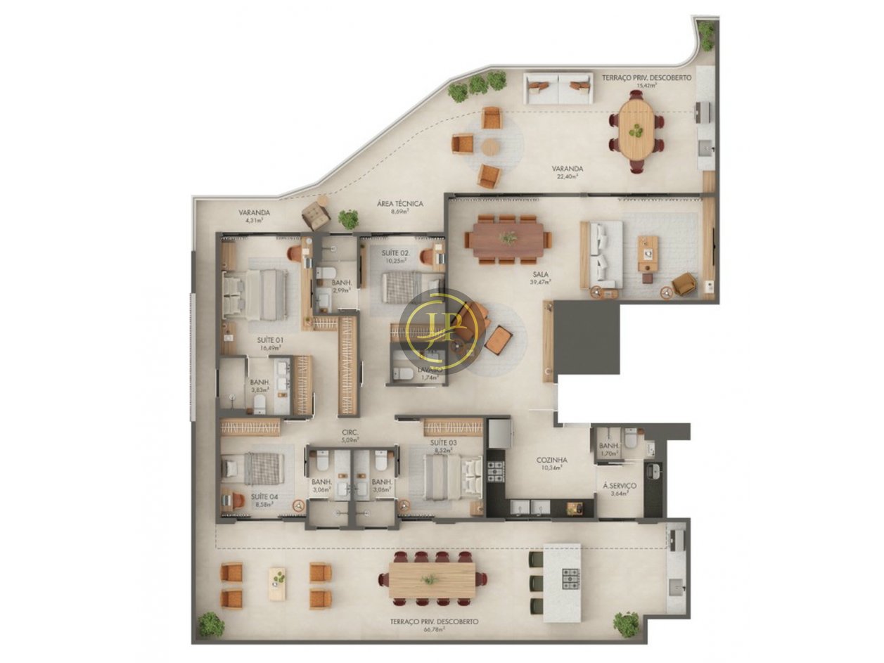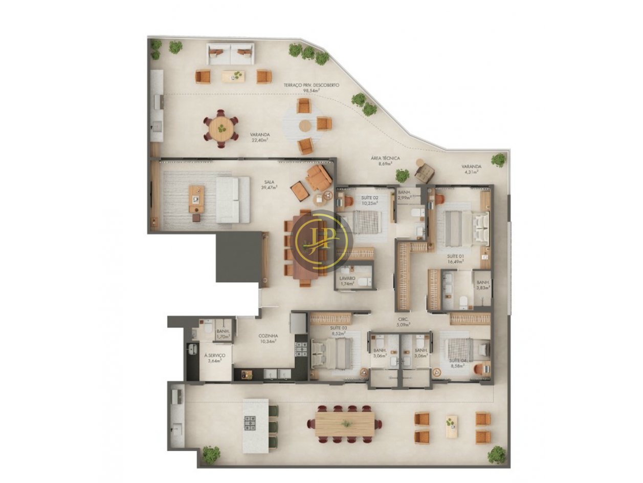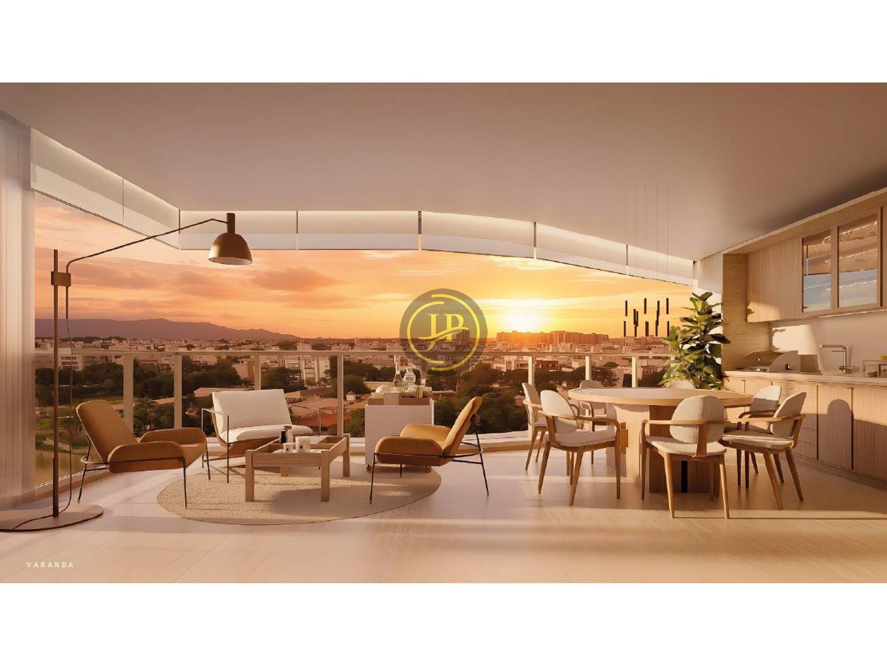 Apartamento Garden Suspenso de 04 suítes, sala para dois ambientes, varanda, espaço garden, lavabo, cozinha, área de serviço, banheiro de serviço e 03 vagas de garagem.
