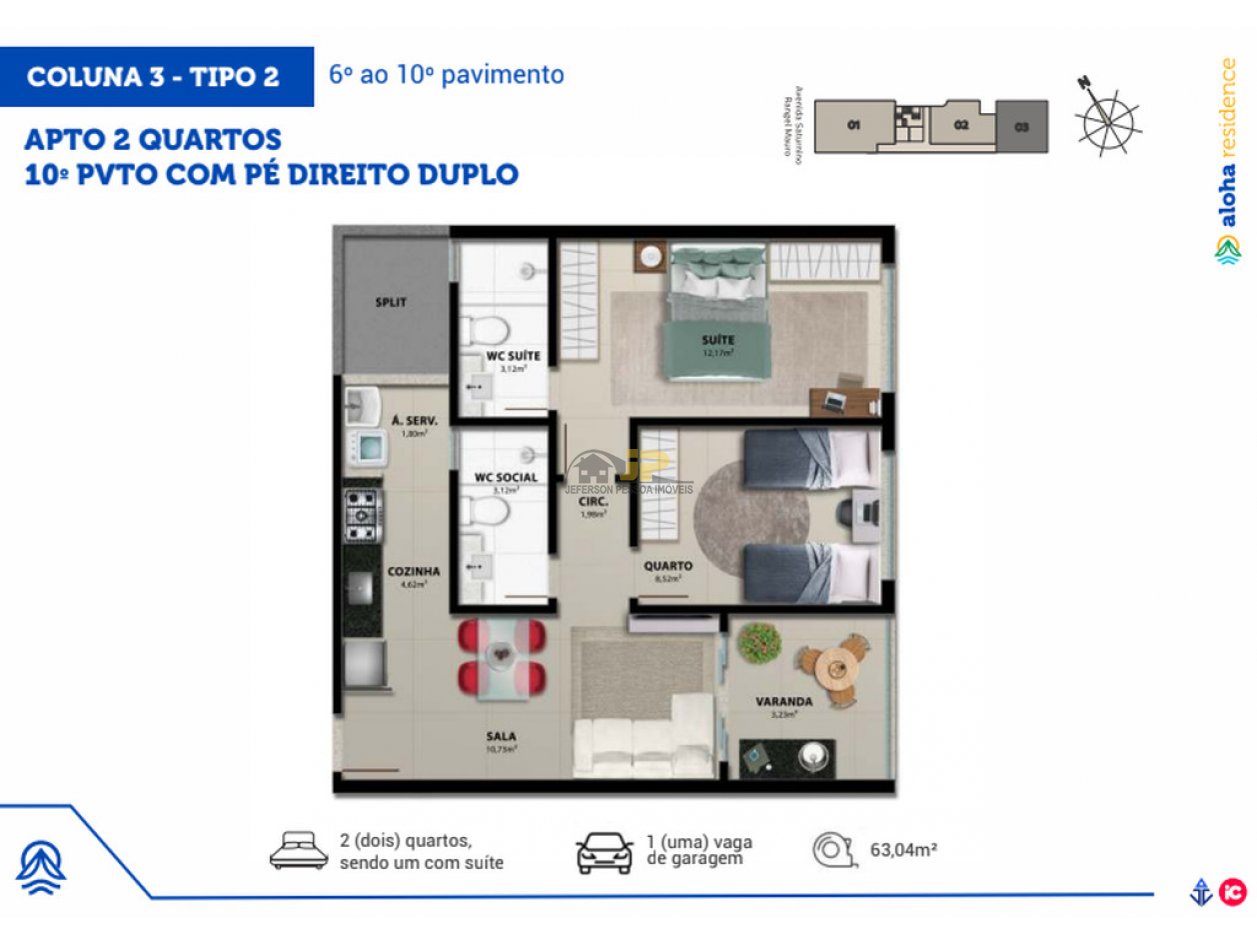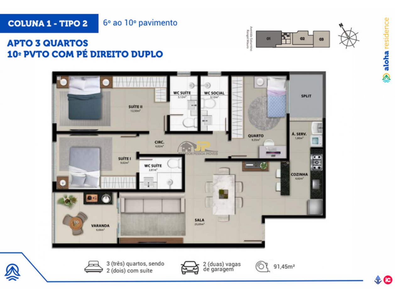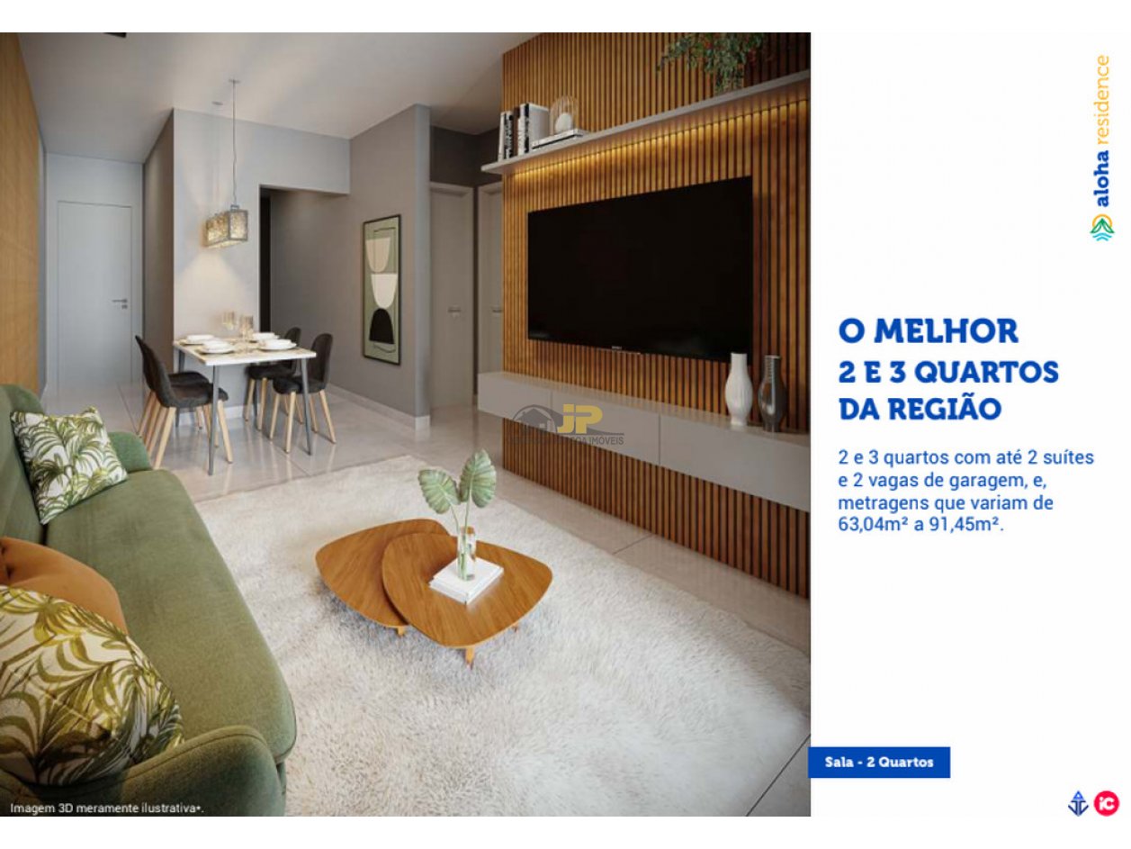 Apartamentos com 91,45m², 3 quartos/ 2 suítes, sala para dois ambientes, varanda gourmet, cozinha, banheiro social, área de serviço e 2 vagas de garagem.