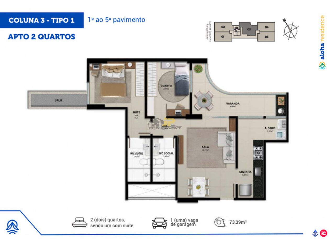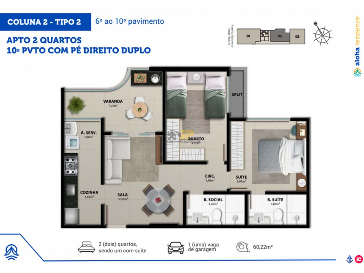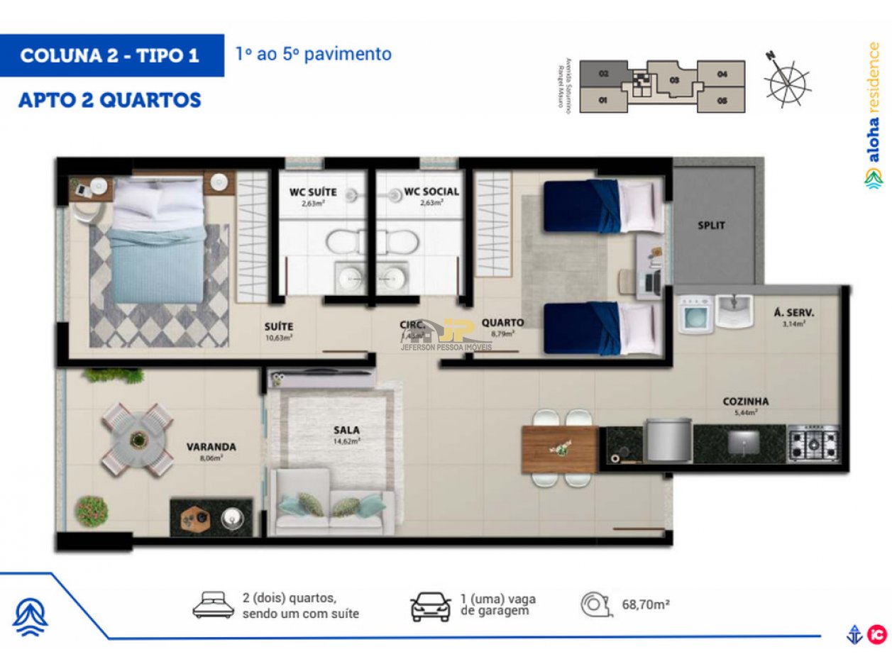 Apartamentos com 91,45m², 3 quartos/ 2 suítes, sala para dois ambientes, varanda gourmet, cozinha, banheiro social, área de serviço e 2 vagas de garagem.