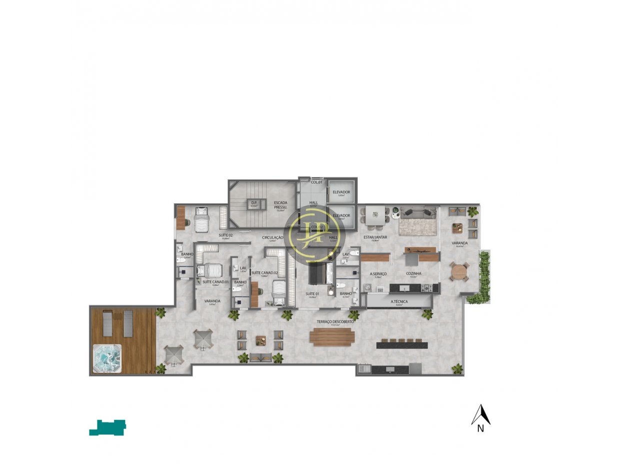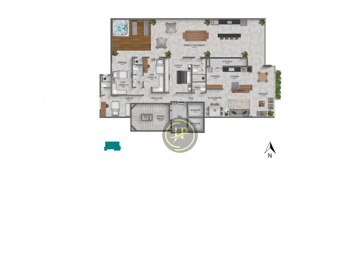 Apartamento Garden de 04 suítes sendo 02 canadenses e 01 com varanda, sala ampla para dois ambientes, terraço descoberto, varanda, cozinha, lavabo, área de serviço e 03 vagas de garagem.