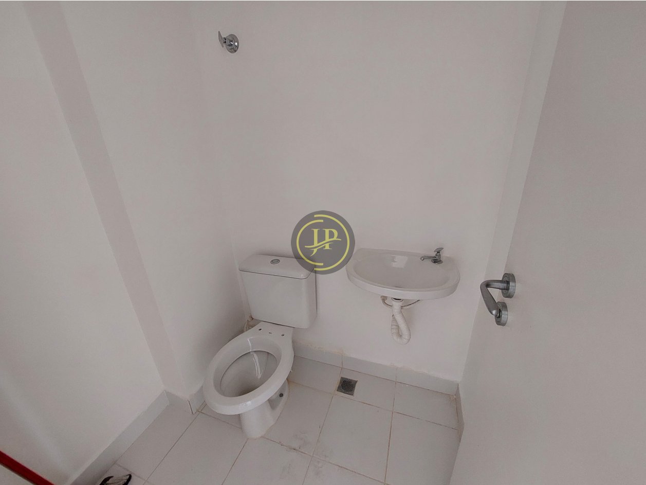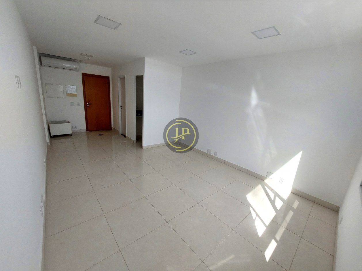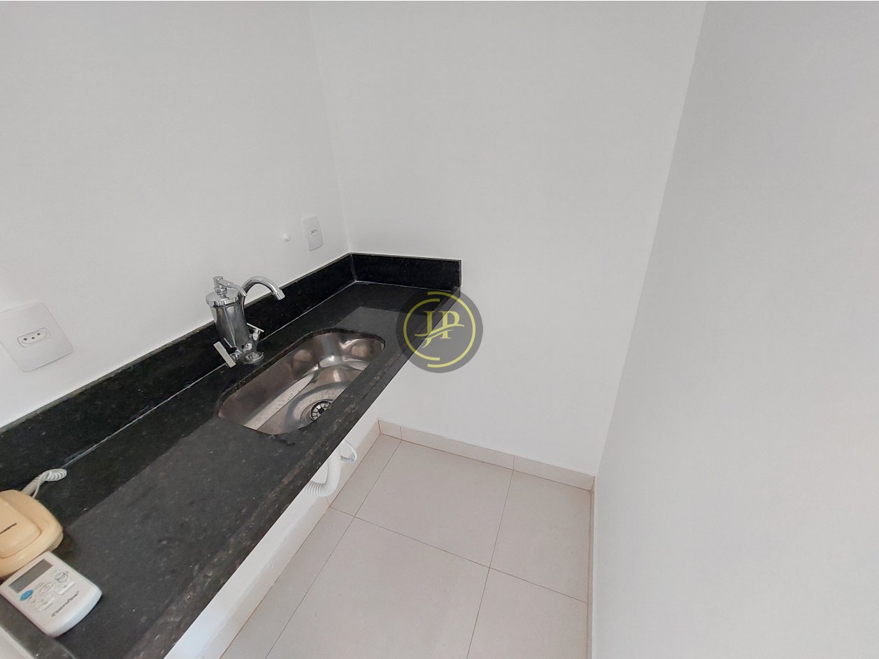 Sala comercial ampla, com vista livre e iluminação natural, ar condicionado, copa e banheiro, piso em porcelanato e com vaga de garagem.