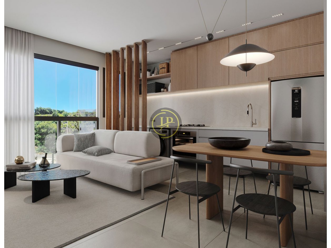 Apartamento studio com sala, cozinha e banheiro.