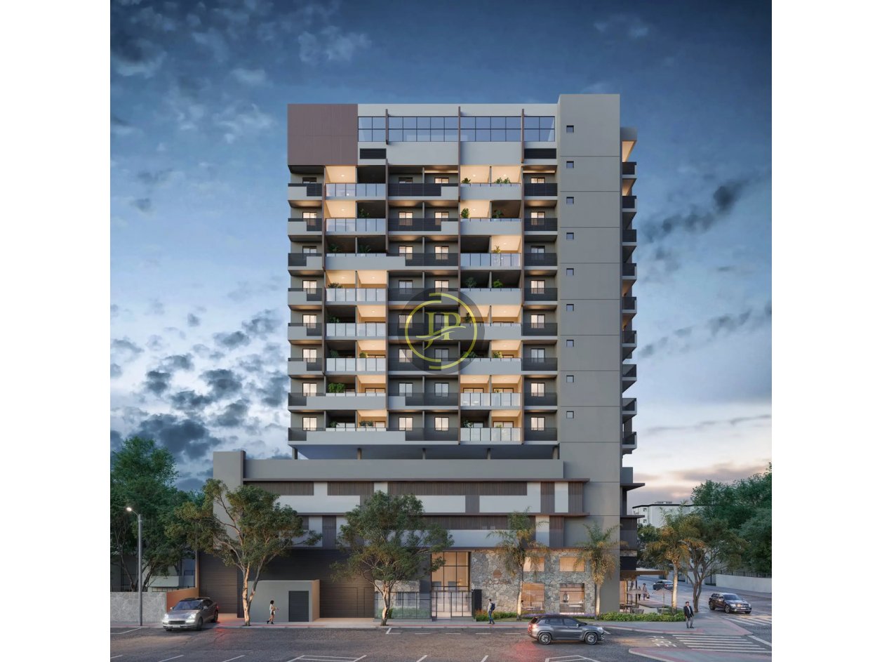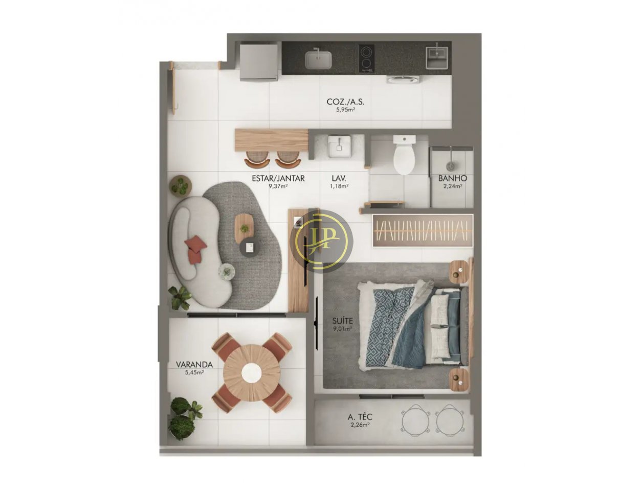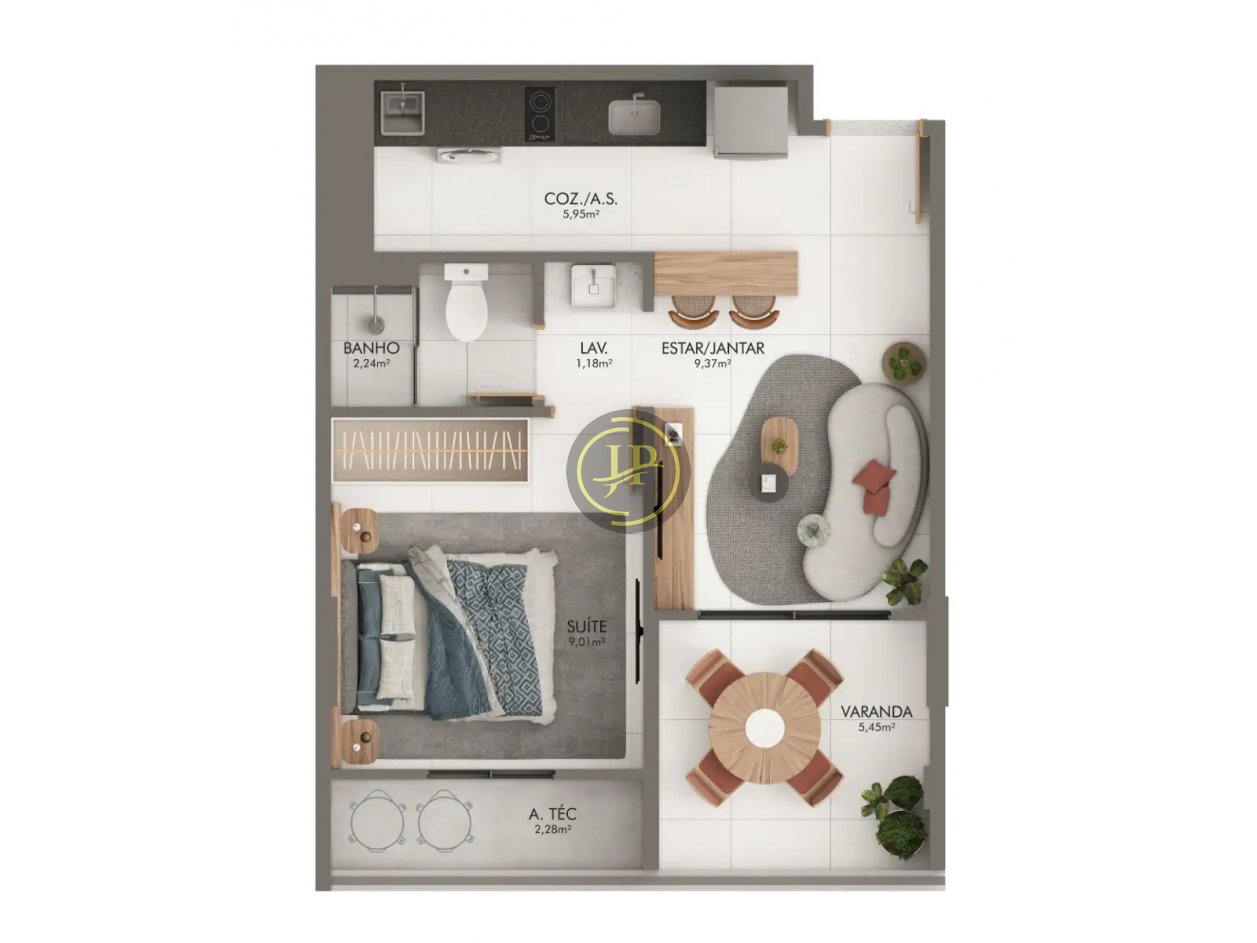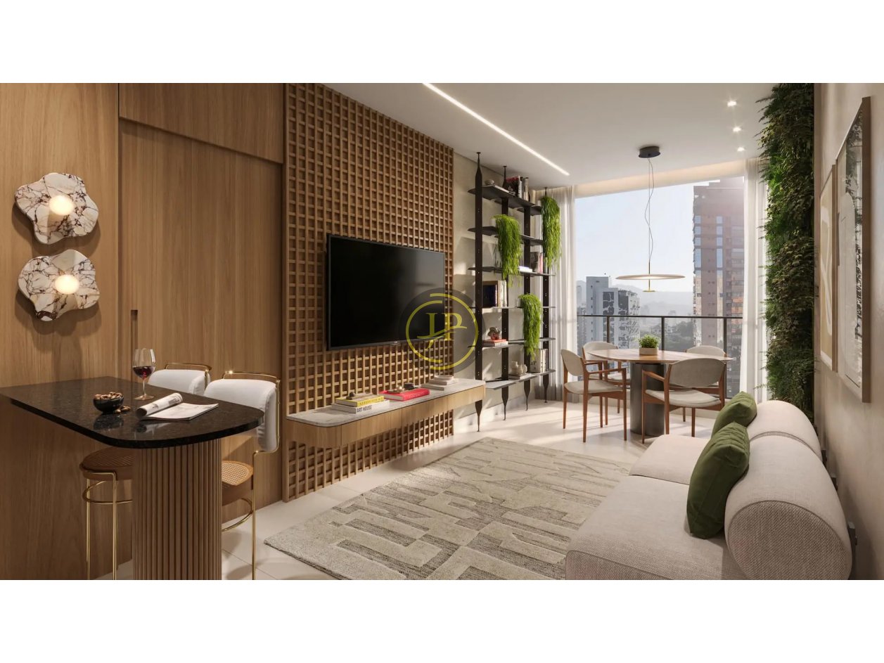 Apartamento de 01 quarto com 41,06m², sala para dois ambientes, varanda, cozinha, banheiro e vaga de garagem.
